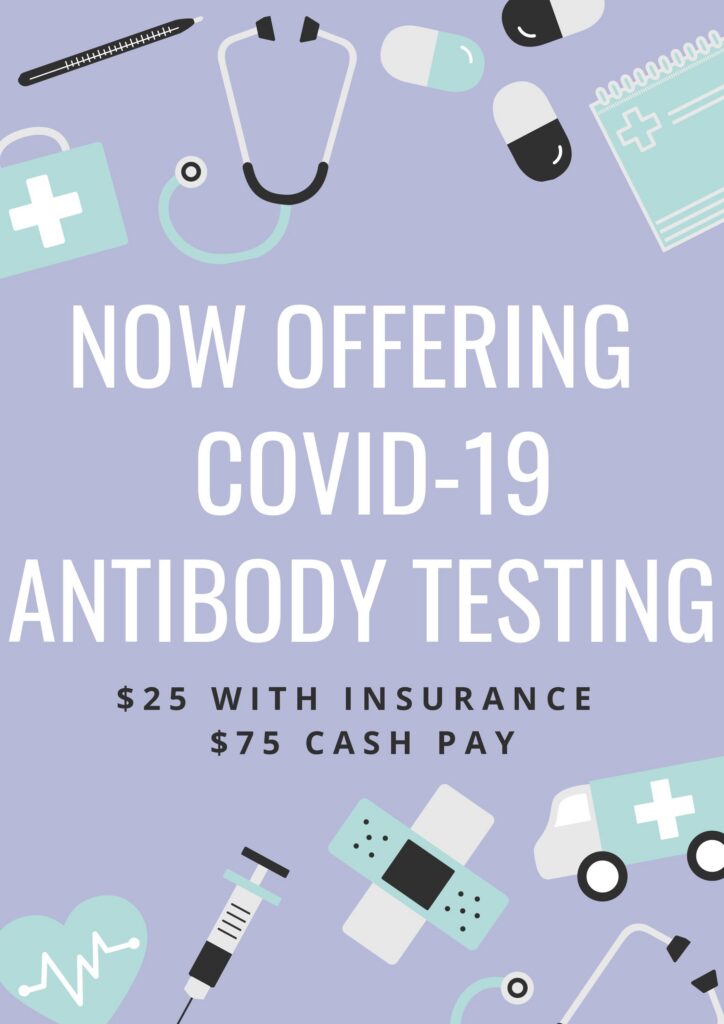 Quest labs and LabCorp are now offering antibody testing to determine COVID-19 exposure. The test detects antibodies that indicate the patient has been exposed to COVID-19. It is a standard blood test that must be performed in our office or antibody testing will require a lab order from our provider for Covid-19 antibody testing to be performed at a LabCorp or Quest lab location.