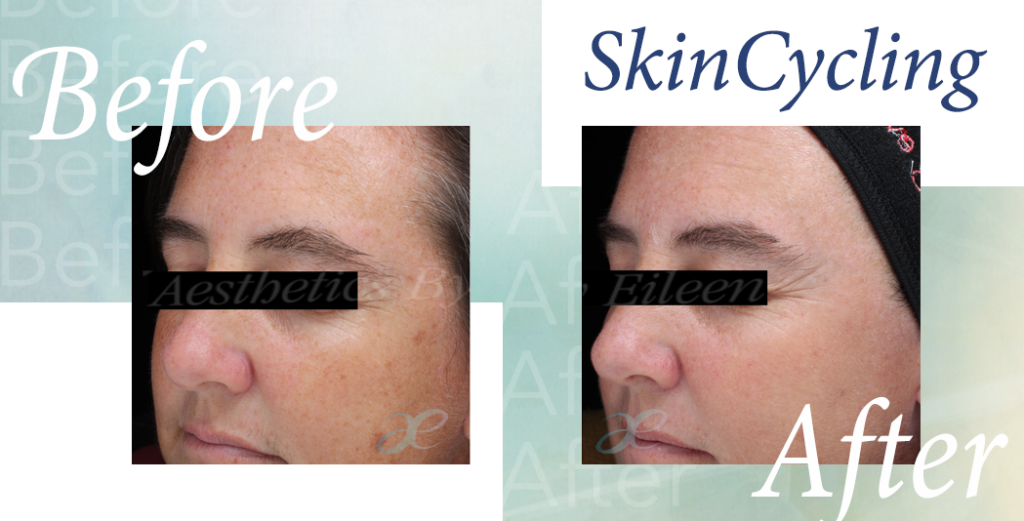 At Aesthetics By Eileen Laser and Skin Care Medical Spa we have designed a program that specifically can lessen and erase photoaged, sundamaged skin, bringing back the “Youthfully You.” We want to cycle out the old skin and replace it with healthy glowing skin. Skin cycling is 5 easy treatments. It’s 5 treatments for 5 weeks in a row. Best part no pain, no downtime, and no numbing cream. Skin Cycling is using photo-thermal energy known as IPL (Intense Pulse light) or BBL (Broadbrand light). Specific settings are used and tailored to each individual.